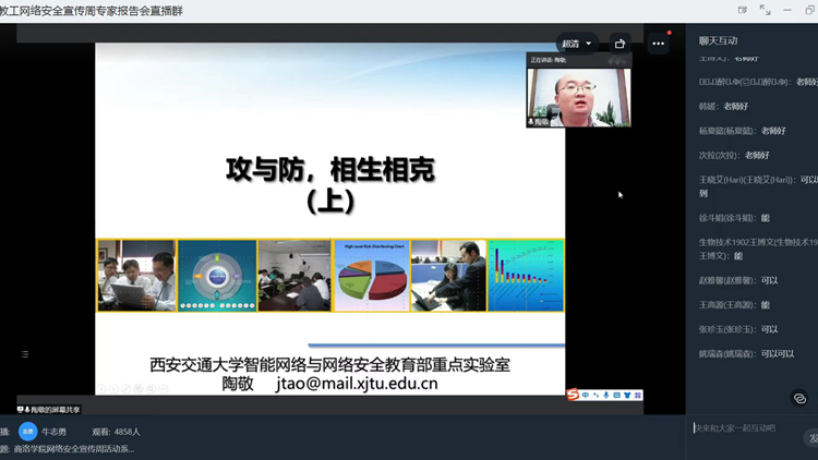 為推動第九屆網(wǎng)絡(luò)安全宣傳周活動深入開展,提升師生網(wǎng)絡(luò)安全意識和防護技能,營造網(wǎng)絡(luò)安全人人有責(zé)、網(wǎng)絡(luò)安全人人參與的濃厚氛圍,9月7日下午,我校通過線上平臺舉辦網(wǎng)絡(luò)安全知識專家報告會。大會邀請西安交通大學(xué)網(wǎng)絡(luò)空間安全學(xué)院副院長、智能網(wǎng)絡(luò)與網(wǎng)絡(luò)安全教育部重點實驗室副主任陶敬老師作了題為《攻與防,相生相克!》的專題報告。報告會由信息化建設(shè)與管理處負(fù)責(zé)人付軍昌主持,各單位網(wǎng)絡(luò)安全和信息化工作負(fù)責(zé)人、網(wǎng)絡(luò)安全和信息化專員,教師代表及2019、2020、2021級全體學(xué)生5000余人線上參加報告會。