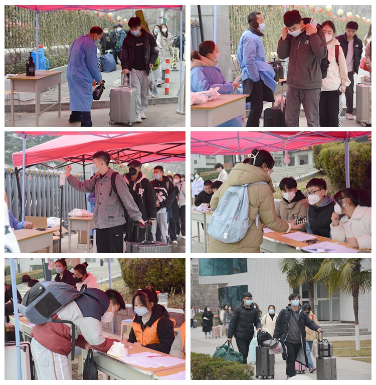 返校期間,各地學(xué)生嚴(yán)格按照流程,在規(guī)定時(shí)間內(nèi)分別從指定校門進(jìn)入,經(jīng)過(guò)行李消殺、口罩更換、測(cè)量體溫,再到所在學(xué)院現(xiàn)場(chǎng)辦公處進(jìn)行登記后返回宿舍。學(xué)生處、團(tuán)委及各二級(jí)學(xué)院安排志愿者幫助入校學(xué)生搬運(yùn)行李、辦理登記手續(xù),提供暖心服務(wù)。