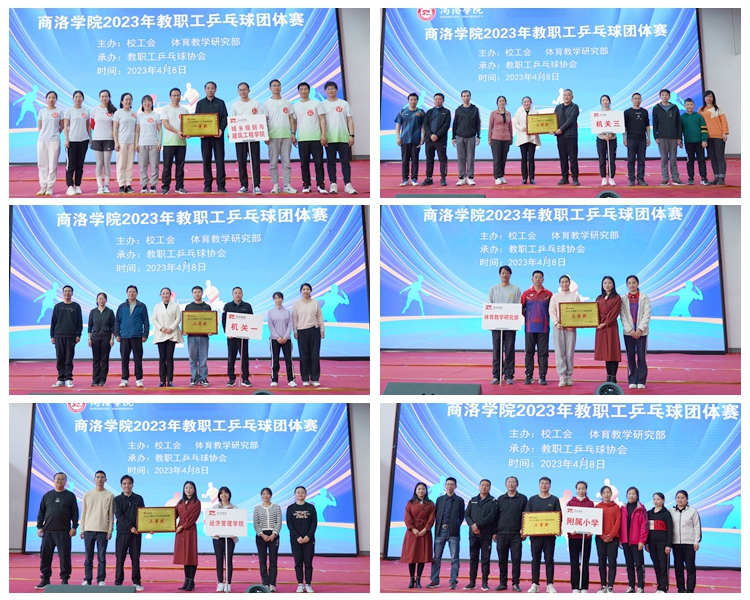 4月8日,我校2023年教職工乒乓球團(tuán)體賽在丹江校區(qū)體育館順利舉行。來(lái)自學(xué)校各工會(huì)分會(huì)以及商洛學(xué)院附屬小學(xué)、附屬幼兒園的17支代表隊(duì),包括運(yùn)動(dòng)員、裁判員及教練200余人參加了比賽。副校長(zhǎng)王新軍、商洛學(xué)院附屬小學(xué)校長(zhǎng)趙阿玲、附屬幼兒園園長(zhǎng)劉莉莉出席活動(dòng)并為獲獎(jiǎng)代表隊(duì)頒獎(jiǎng)。工會(huì)及體育教學(xué)研究部相關(guān)負(fù)責(zé)人參加活動(dòng)。