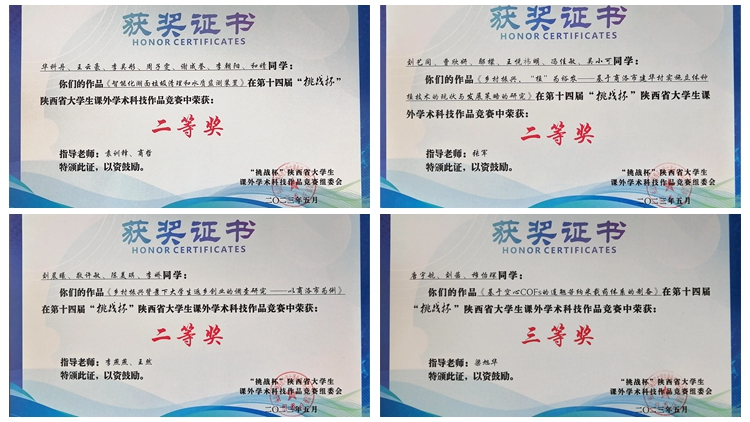 5月20日,由團(tuán)省委、省委教育工委、省科技廳、省科協(xié)、省社會(huì)科學(xué)院、省學(xué)聯(lián)、西咸新區(qū)管委會(huì)共同主辦,長(zhǎng)安大學(xué)承辦的第十四屆“挑戰(zhàn)杯”陜汽集團(tuán)陜西省大學(xué)生課外學(xué)術(shù)科技作品競(jìng)賽閉幕式暨頒獎(jiǎng)儀式在長(zhǎng)安大學(xué)舉行。我校在本次大賽中榮獲佳績(jī),其中二等獎(jiǎng)3項(xiàng),三等獎(jiǎng)1項(xiàng)。