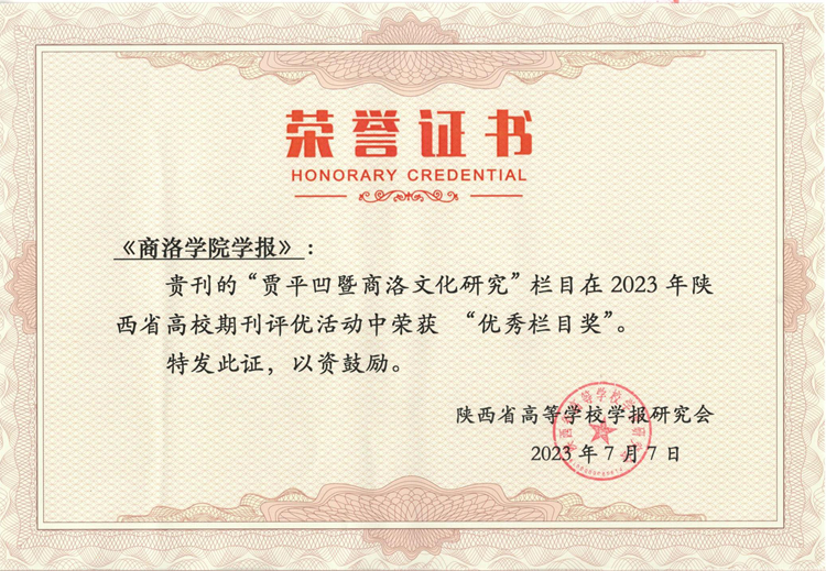 7月7日,2023年度陜西省高校期刊評優(yōu)結(jié)果揭曉,我校主辦的《商洛學(xué)院學(xué)報》被評為“陜西高校精品社科期刊”,學(xué)報優(yōu)勢欄目“賈平凹暨商洛文化研究”獲“優(yōu)秀欄目獎”。
