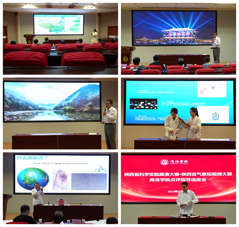 參加比賽的9組隊伍分別通過現(xiàn)場講解、視頻展示、實驗展演、情景劇場等方式展示了團隊的科普作品。由商洛市科協(xié)科普部部長陳淑萍及我校相關(guān)專家組成的評委分別從選題方向、受眾群體、場景設(shè)計、肢體語言、實驗環(huán)節(jié)、講解技巧等方面進行了點評與指導(dǎo)。經(jīng)過現(xiàn)場評議,推薦王毅夢、屈佳、何念竹3個團隊參加陜西省科學(xué)實驗展演大賽;推薦房舒、張博、王緒旺3位教師參加陜西省氣象科普視頻大賽。
