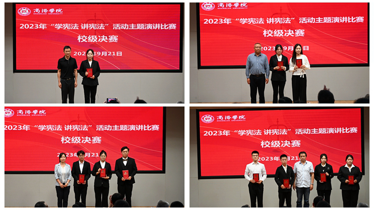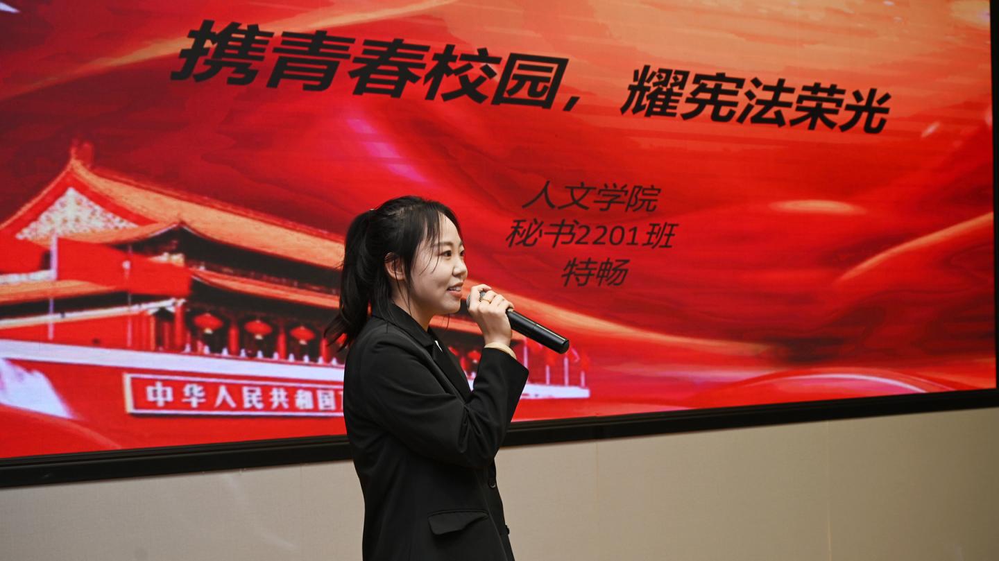 本次比賽自7月份啟動,由二級學院選拔推薦10名學生進入校級決賽。決賽中,選手們圍繞“憲法與國家、憲法與社會、憲法與個人、社會主義法治國家”等主題,從習近平法治思想、憲法法治知識、身邊案例、新聞事件等方面入手,圍繞憲法學習感悟,結合成長經歷,講述憲法故事,表達了努力成長為社會主義法治的忠實崇尚者、自覺遵守者、堅定捍衛(wèi)者,帶頭做憲法的“代言人”的決心。最終人文學院學生特暢榮獲一等獎,藝術學院學生姜荷、化材學院學生杜晴洋獲二等獎,馬克思主義學院學生李宇航、電信學院學生和婧、經管學院學生劉徹獲三等獎,健康學院學生程怡、建工學院學生劉宇、生物學院學生張鈺晨、數計學院學生雷嘉龍獲優(yōu)秀獎。