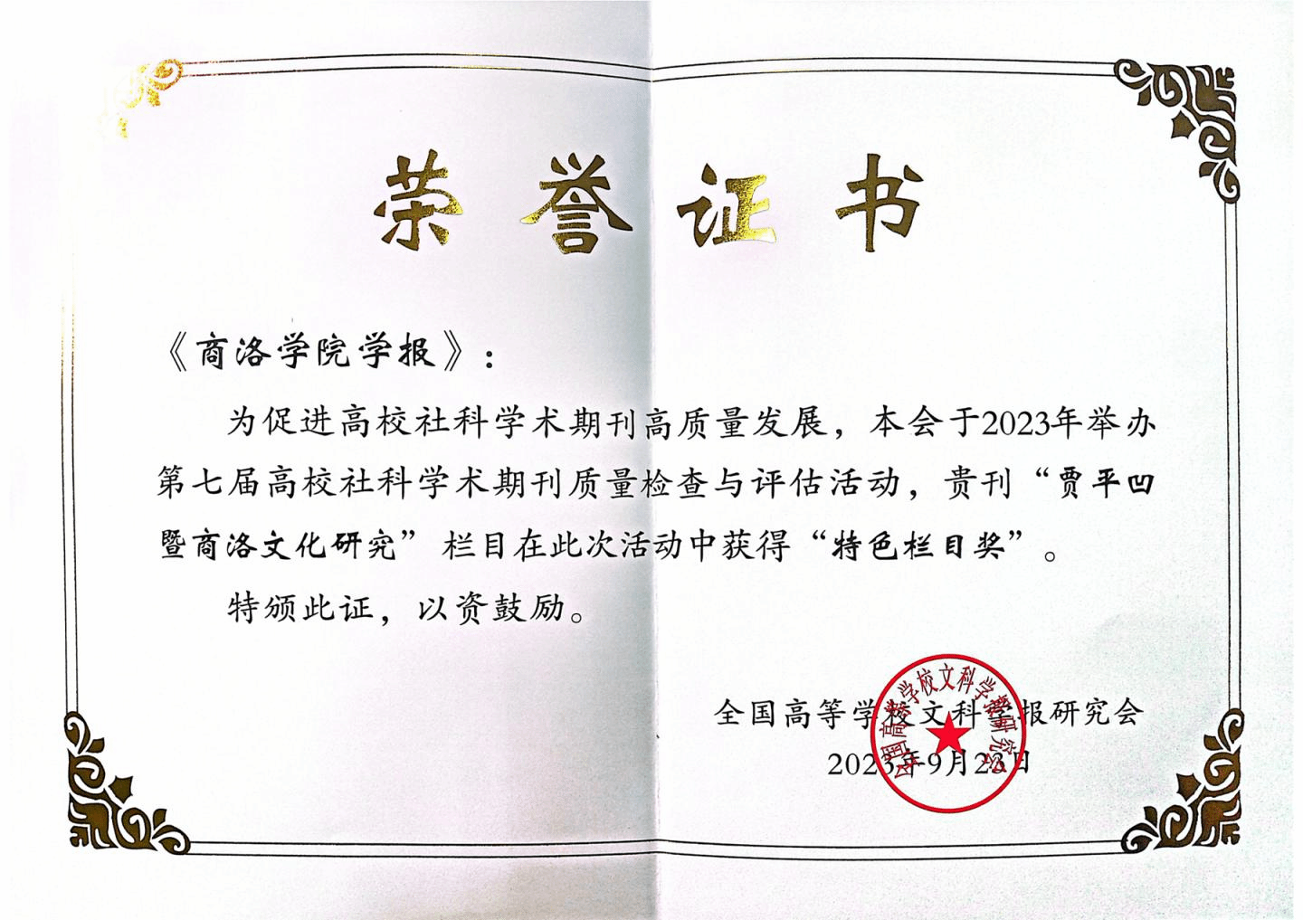全國(guó)高等學(xué)校文科學(xué)報(bào)研究會(huì)舉辦的2023年(第七屆)高校社科學(xué)術(shù)期刊質(zhì)量檢查與評(píng)估活動(dòng)結(jié)果日前公布,我校學(xué)報(bào)“賈平凹暨商洛文化研究”欄目獲“全國(guó)高校社科期刊特色欄目獎(jiǎng)”。這是繼“陜西高校精品社科期刊”和“優(yōu)秀欄目獎(jiǎng)”之后,我校學(xué)報(bào)今年取得的又一佳績(jī)。
