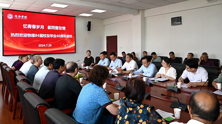 王新軍在致辭中代表學(xué)校對(duì)物理84屆校友返校聚會(huì)表示熱烈歡迎,對(duì)校友們心系母校發(fā)展、支持母校建設(shè)表示衷心感謝,并重點(diǎn)介紹了學(xué)校在教學(xué)、科研、服務(wù)社會(huì)和校友工作開展等方面取得的突出成就。他指出,校友是母校最寶貴的財(cái)富,是母校事業(yè)發(fā)展最可信賴的力量,在學(xué)校社會(huì)地位與影響提升中發(fā)揮著重要的名片效應(yīng)。他希望校友們?;啬感?纯?,多為母校的發(fā)展獻(xiàn)計(jì)獻(xiàn)策,在母校的新征程中一如既往地支持母校、關(guān)愛母校。學(xué)校將扎實(shí)做好校友服務(wù)工作,構(gòu)筑學(xué)校與校友互動(dòng)互益的橋梁,為把我校建成特色鮮明的一流應(yīng)用型本科院校共同努力奮斗。