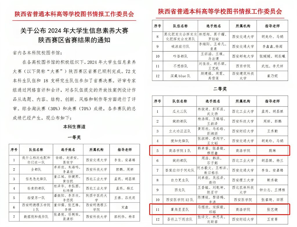 近日,2024年大學生信息素養(yǎng)大賽陜西賽區(qū)省賽結果公布,商洛學院2支參賽隊伍榮獲本科生賽道二等獎。