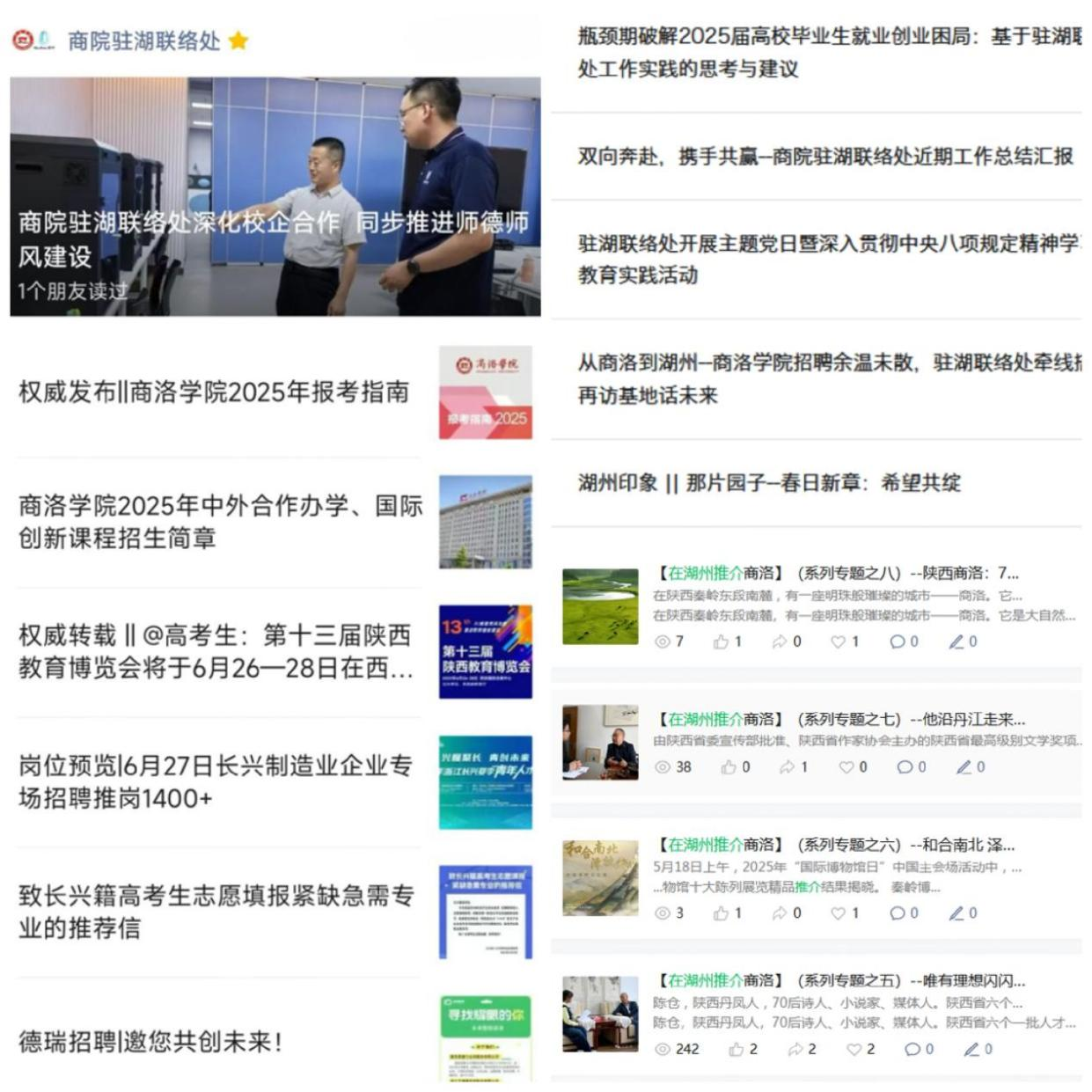 講好商院故事,提升社會(huì)影響力。通過“商院駐湖聯(lián)絡(luò)處”公眾號發(fā)布聯(lián)絡(luò)處工作動(dòng)態(tài)、階段性工作總結(jié)、學(xué)校重點(diǎn)新聞、就業(yè)政策解讀、企業(yè)招聘動(dòng)態(tài)等內(nèi)容260余篇。其中,發(fā)布“在湖州推介商洛”系列內(nèi)容8篇,發(fā)表《商洛學(xué)院駐湖州就業(yè)人才工作聯(lián)絡(luò)處積極開展系列活動(dòng)》《雙向奔赴,攜手共贏--商院駐湖聯(lián)絡(luò)處近期工作總結(jié)匯報(bào)》《湖州·商洛學(xué)院:共譜雙向奔赴之華章》等總結(jié)綜述性文章6篇,構(gòu)筑起“信息集散地”與“校地交流窗口”的雙向樞紐,既主動(dòng)向外展示學(xué)校形象、聯(lián)絡(luò)處成果與商洛特色,亦向內(nèi)傳遞湖州產(chǎn)業(yè)生態(tài)、就業(yè)趨勢與政策紅利。