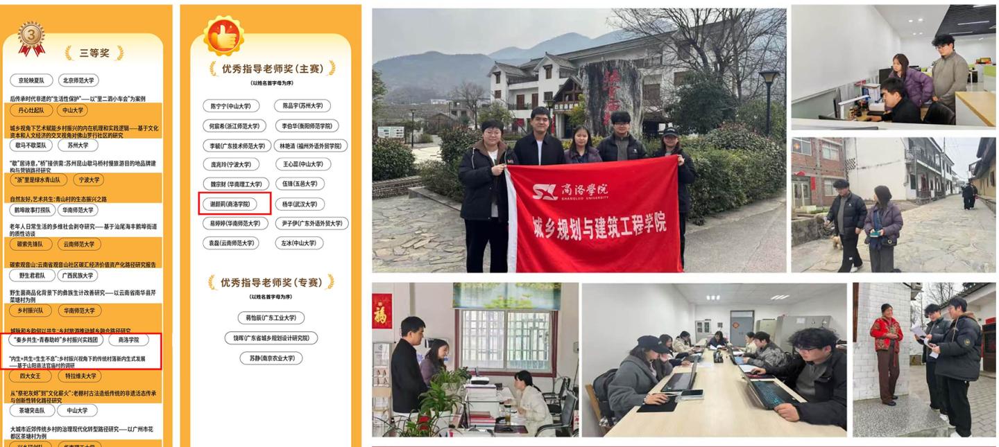 近日,第十屆全國大學(xué)生“發(fā)現(xiàn)傳統(tǒng)村落”調(diào)研大賽獲獎(jiǎng)名單正式公布。我校建工學(xué)院“秦鄉(xiāng)共生?青春助嶺”鄉(xiāng)村振興實(shí)踐團(tuán)提交的作品《“內(nèi)生 + 共生 = 生生不息”:鄉(xiāng)村振興視角下的傳統(tǒng)村落新內(nèi)生式發(fā)展——基于山陽縣法官廟村的調(diào)研》榮獲大賽三等獎(jiǎng),團(tuán)隊(duì)指導(dǎo)老師謝顏莉獲評(píng)“優(yōu)秀指導(dǎo)老師”。這是我校首次在該項(xiàng)全國性賽事中獲獎(jiǎng),展現(xiàn)了我校在服務(wù)鄉(xiāng)村振興戰(zhàn)略中的實(shí)踐育人成效與跨學(xué)科創(chuàng)新能力。