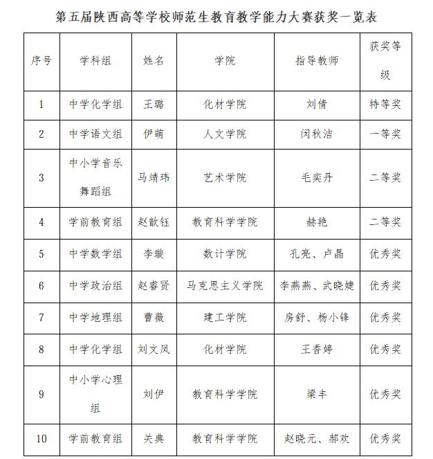 近日,陜西省教育廳公布了第五屆陜西高等學(xué)校師范生教育教學(xué)能力大賽獲獎名單,我校在此次大賽中獲獎10項,其中特等獎1項、一等獎1項、二等獎2項、優(yōu)秀獎6項。