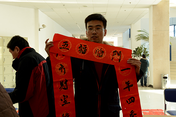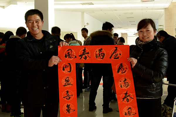 活動(dòng)現(xiàn)場(chǎng),“五湖四海皆春色 萬水千山盡得輝”、“和順一門有百福 平安二字值千金” 、“綠竹別其三分景 紅梅正報(bào)萬家春”、“壯麗山河多異彩 文明國(guó)度遍高風(fēng)”……一張張紅紙上寫滿了新春的祝福語。師生們圍繞在書法家周圍選擇自己心儀的祝福話語,書法家們揮毫潑墨,一一滿足廣大師生的心愿,淡淡的墨香伴著師生幸福的笑臉為校園增添了濃濃的年味。
