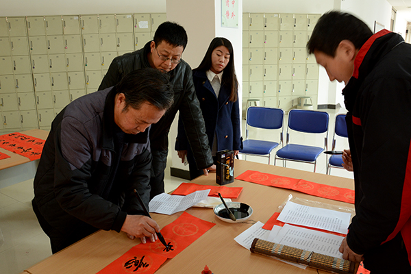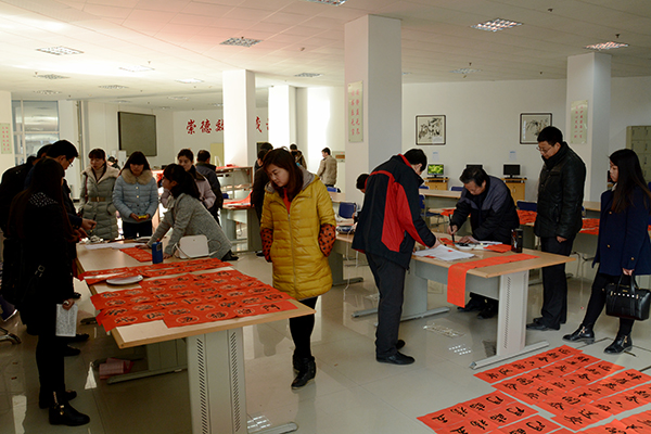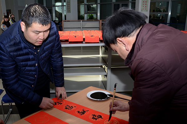為了弘揚(yáng)中華民族傳統(tǒng)文化,豐富校園文化生活,營(yíng)造歡樂的節(jié)日氛圍,1月14日-15日,校工會(huì)聯(lián)合學(xué)校書法家協(xié)會(huì)舉辦了“迎新春 送春聯(lián)”活動(dòng)。我校書法家協(xié)會(huì)主席李尚民,書法家協(xié)會(huì)會(huì)員李中合、劉全民、王思根、黃新春、葉玉印、祁志華等在圖書館大廳鋪開紅紙和筆墨,為師生們書寫、贈(zèng)送春聯(lián)。