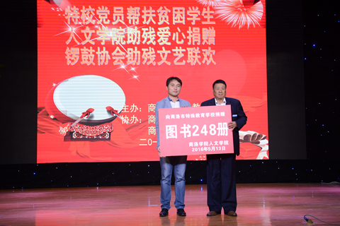 在“第26個(gè)助殘日”來(lái)臨之際,5月13日,人文社會(huì)科學(xué)學(xué)院與商洛市特殊教育學(xué)校聯(lián)合舉辦了慶?!暗?6個(gè)助殘日”愛(ài)心聯(lián)歡活動(dòng)。人文學(xué)院團(tuán)總支書記劉征文代表全院師生向商洛市特教學(xué)校捐贈(zèng)了248冊(cè)圖書,同學(xué)們與特教學(xué)校的孩子們、商洛市鑼鼓隊(duì)等愛(ài)心組織表演了精心準(zhǔn)備的節(jié)目。我校學(xué)生會(huì)干部在團(tuán)委相關(guān)負(fù)責(zé)人的帶領(lǐng)下參加了活動(dòng)。