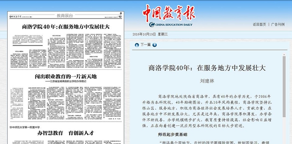 10月19日,《中國(guó)教育報(bào)》以《商洛學(xué)院40年:在服務(wù)地方中發(fā)展壯大》為題,刊發(fā)了校黨委書記、校長(zhǎng)劉建林的署名文章。文章從“師范起步奠基礎(chǔ),特色辦學(xué)求發(fā)展,植根地方促轉(zhuǎn)型”三個(gè)方面,全面回顧了我校建校40年、升本10年來(lái),堅(jiān)持扎根山區(qū)、服務(wù)地方,在服務(wù)地方中不斷發(fā)展壯大的特色發(fā)展之路??偨Y(jié)了我校凝練打造以秦嶺現(xiàn)代中藥資源和綠色食品開(kāi)發(fā)利用,秦嶺礦產(chǎn)資源綜合開(kāi)發(fā)利用,賈平凹研究、秦嶺畫派等地方文化傳承創(chuàng)新為代表的辦學(xué)特色,深入開(kāi)展“根植地方行動(dòng)計(jì)劃”的實(shí)踐和成果。