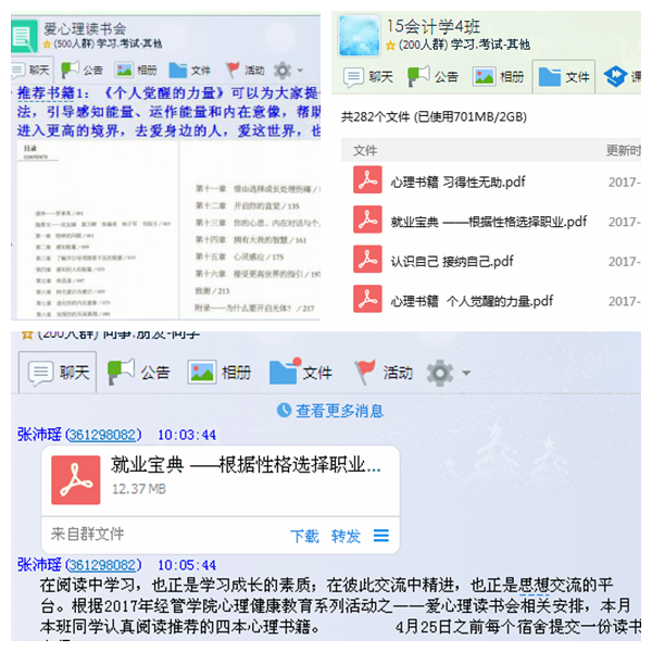 此次讀書活動以網(wǎng)絡(luò)(QQ、微信群)為平臺組建“愛心理讀書會”,心理輔導(dǎo)員定期推薦閱讀與大學(xué)生生活密切相關(guān)的心理書籍,將PDF電子版本的《個人覺醒的力量》、《習(xí)得性無助》、《認識自己,接納自己》和《就業(yè)寶典:根據(jù)性格選擇職業(yè)》等心理書籍傳至群共享,各班心理委員組織學(xué)生在固定時間進行線下集體閱讀,每個周三下午與心理輔導(dǎo)員進行線上溝通、答疑解惑,4月底各班提交讀書心得并開展全院讀書評比活動,達到吸引讀書、方便讀書的活動目的。