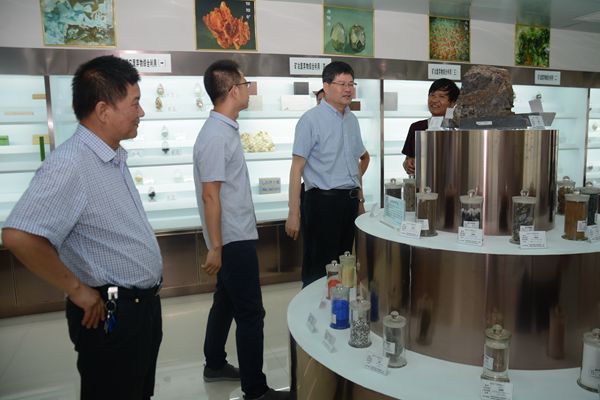 史高領(lǐng)一行深入重點實驗室沙盤標本陳列室、有價元素提取室、材料制備室、材料性能檢測室、尾礦無害化處理室等處,詳細考察了實驗室硬件設(shè)施建設(shè)、配備情況和項目研究工作開展進度。我校化材學(xué)院院長、尾礦資源綜合利用重點實驗室主任周春生做了詳細講解。
