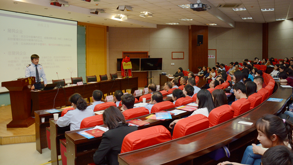 王思懷代表師生對此次稅法活動走進我校表示歡迎并發(fā)表講話。他指出,我校歷來高度重視加強師生法治教育、安全教育和誠信教育,在經(jīng)管學院開設了稅法課程,借助課堂教學和每年入學教育、國家憲法日等節(jié)點開展全校師生參與度高的法律知識普及系列主題活動,加大普法宣傳力度,在師生頭腦中樹立起了較強的法律意識。他表示,開展稅法進校園活動既可以進一步普及稅法知識,增強師生稅法意識,也為落實雙方之間的戰(zhàn)略合作協(xié)議開辟了一條新路徑。我們將以此為契機,進一步深入學習黨的十九大報告有關財稅體制改革目標和任務的論述,深入學習我國稅改所取得的成效、未來深化改革所涉及的增值稅、個人所得稅以及新房地產(chǎn)稅三大熱點稅種改革,廣泛學習宣講稅法知識,進一步增強全校師生稅收法治觀念。