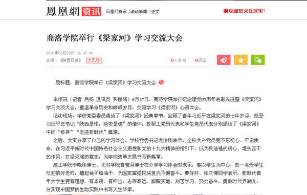 6月27日,我校召開慶祝建黨97周年表彰先進暨《梁家河》學習交流大會,師生同臺深情誦讀《梁家河》經典章節(jié),重溫革命歷史和崢嶸歲月,交流學習《梁家河》心得體會,共聚一堂熱烈慶祝黨的生日。活動舉辦后,《陜西日報》、陜西省教育廳網(wǎng)站、陜西黨建網(wǎng)、中華誦網(wǎng)站、華商頭條、搜狐網(wǎng)、鳳凰網(wǎng)、三秦網(wǎng)、《商洛日報》等媒體紛紛進行報道,取得了良好的傳播效果,營造了濃厚的《梁家河》學習宣傳氛圍。