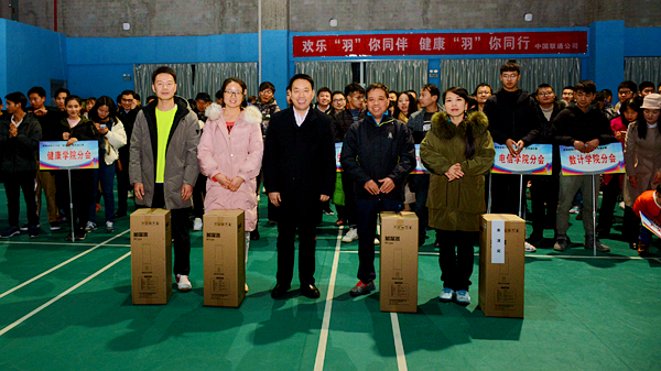 12月24日,由我校工會(huì)、體育教學(xué)研究部、繼續(xù)教育學(xué)院聯(lián)合主辦的2018年“聯(lián)通杯”羽毛球賽圓滿落幕,校黨委副書(shū)記、工會(huì)主席彭虎軍出席閉幕式。中國(guó)聯(lián)通公司商洛分公司副總經(jīng)理陳安民,商州區(qū)營(yíng)服中心經(jīng)理田少波、副經(jīng)理王建霞,我校工會(huì)、繼續(xù)教育學(xué)院、體育教學(xué)研究部相關(guān)負(fù)責(zé)人、各工會(huì)分會(huì)負(fù)責(zé)人及參賽師生一起參加了閉幕式。