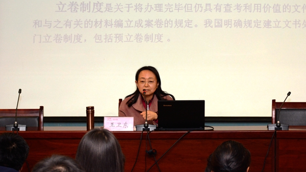 王衛(wèi)東以《文件材料的立卷歸檔及其方法》為題,結(jié)合自身檔案工作經(jīng)歷,全面系統(tǒng)地為我校檔案工作人員闡釋了立卷歸檔工作的重要性及文書立卷人員職責(zé),詳細(xì)介紹了立卷歸檔工作的方法、流程和操作實(shí)務(wù)。她還現(xiàn)場(chǎng)為我校檔案管理工作人員答疑解惑,把長(zhǎng)安大學(xué)的檔案管理理念和她個(gè)人的工作經(jīng)驗(yàn)分享給與會(huì)人員。她的報(bào)告通俗易懂、生動(dòng)具體,為我??茖W(xué)規(guī)范地做好檔案材料收集、立卷、分類、組卷、編目、移交歸檔等具體工作提供了有益指導(dǎo)。