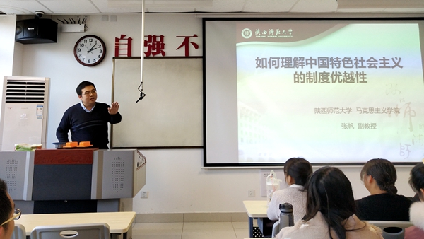 為深入學(xué)習(xí)黨的十九屆四中全會(huì)精神,促進(jìn)思政課教學(xué)改革,提高課堂教學(xué)質(zhì)量。12月4日下午,我校特邀“陜西高校思政課教師大練兵”教學(xué)標(biāo)兵、陜西師范大學(xué)副教授張帆來校,以《如何理解中國特色社會(huì)主義制度的優(yōu)越性》為題講述了一堂公開示范課。我校馬克思主義學(xué)院班子成員、全體教師及思政1801班學(xué)生聆聽了示范課。