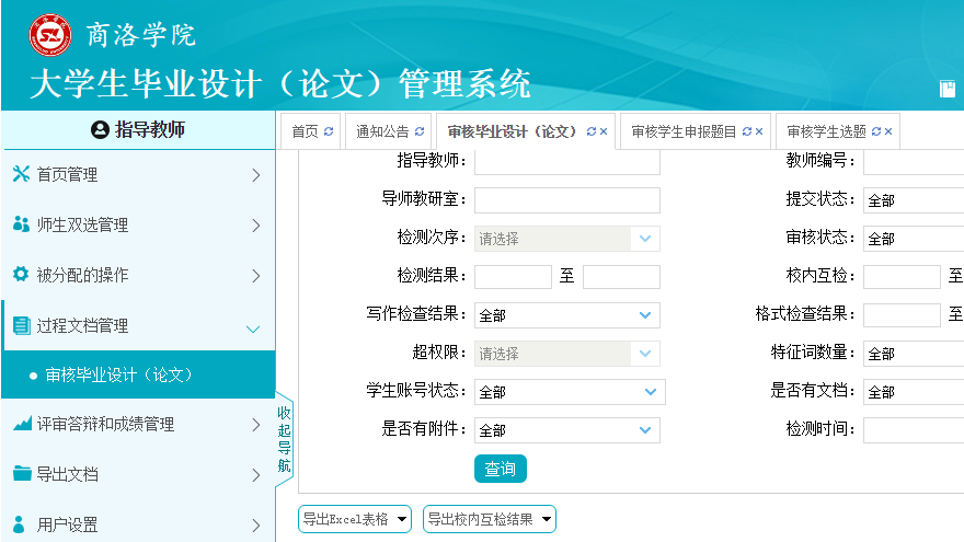 ——線上查重、方便快捷。教務(wù)處與中國知網(wǎng)多次溝通協(xié)商,為我校量身定制了“商洛學(xué)院畢業(yè)論文(設(shè)計)管理系統(tǒng)”,將全體2020屆畢業(yè)生及論文(設(shè)計)指導(dǎo)教師基本信息導(dǎo)入系統(tǒng),免費向師生開放,便于師生論文查重、在線遠(yuǎn)程指導(dǎo)與實時管理,助推我校信息化管理水平不斷提升。為了確保了師生論文查重及在線指導(dǎo)工作順利開展,教務(wù)處還提前進(jìn)行了多次系統(tǒng)調(diào)試、測試,并編制《畢設(shè)管理系統(tǒng)學(xué)生查重操作手冊》《畢設(shè)管理系統(tǒng)教師審核操作手冊》,對師生論文查重過程中的疑難問題給予悉心指導(dǎo)和幫助。一名學(xué)生在使用“商洛學(xué)院畢業(yè)論文(設(shè)計)管理系統(tǒng)”后感慨道:“畢設(shè)管理系統(tǒng)功能強(qiáng)大,方便實用,既省時省力省事,又節(jié)省經(jīng)濟(jì)開支,還實現(xiàn)了全覆蓋,對于高效高質(zhì)完成畢業(yè)生畢業(yè)論文(設(shè)計)發(fā)揮了重要作用”。
