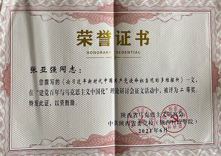 為隆重慶祝建黨百年,總結(jié)回顧馬克思主義中國化的歷史進程、寶貴經(jīng)驗、思想啟示,陜西省馬克思主義研究會與中共陜西省委黨校共同舉辦了“建黨百年與馬克思主義中國化”理論研討會征文活動。我校馬克思主義學院副教授張亞強撰寫的論文《論習近平新時代中國共產(chǎn)黨使命擔當觀的多維探析》在評選活動中榮獲二等獎。