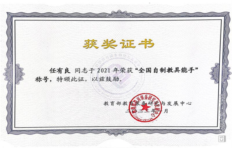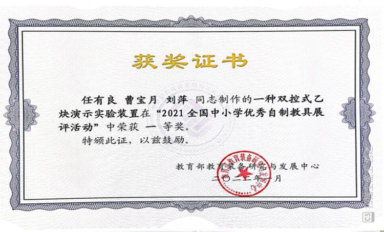 近日,教育部教育裝備研究與發(fā)展中心舉辦了“2021全國中小學(xué)優(yōu)秀自制教具展評活動”,我?;瘜W(xué)工程與現(xiàn)代材料學(xué)院教師任有良、曹寶月、劉萍的參展作品“一種雙控式乙炔演示實(shí)驗(yàn)裝置”獲全國一等獎(jiǎng),任有良獲“全國自制教具能手”稱號。