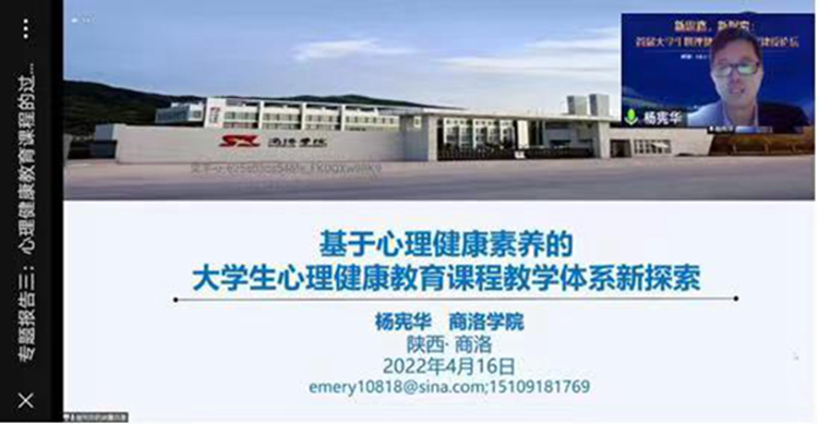 4月16日至17日,中國心理衛(wèi)生協(xié)會大學生心理咨詢專委會聯(lián)合國家社科基金重大項目“國民心理衛(wèi)生素養(yǎng)及其提升機制與對策”項目組舉辦全國“新思路,新探索:首屆大學生心理健康教育課程建設論壇” 線上學術(shù)論壇,我校健康學院楊憲華副教授受邀在“專題報告”環(huán)節(jié)作交流發(fā)言。