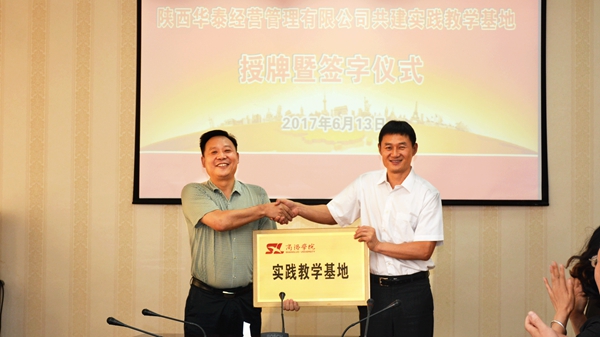 6月13日,我校與陜西華泰經(jīng)營管理有限公司共建實踐教學基地授牌暨簽字儀式在學校四樓會議室舉行。副校長劉勇向陜西華泰經(jīng)營管理有限公司董事長李仁斌授牌。教務處處長李超與陜西華泰經(jīng)營管理有限公司總經(jīng)理閆博簽訂合作協(xié)議。儀式由經(jīng)管學院副院長王怡主持。經(jīng)管學院、建工學院教師代表參加活動。