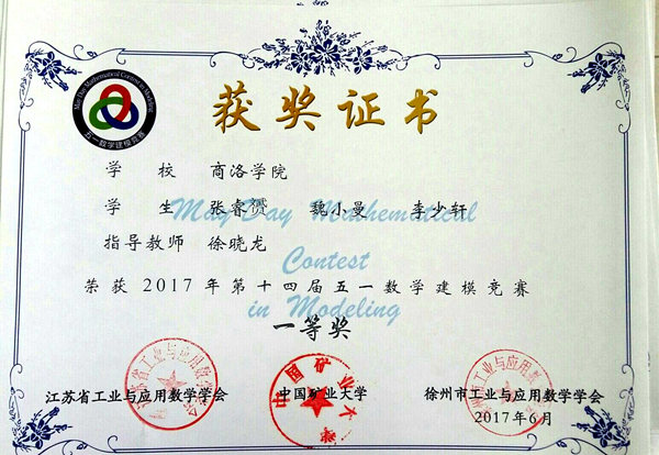 近日,由江蘇省工業(yè)與應(yīng)用數(shù)學(xué)學(xué)會主辦的第十四屆五一數(shù)學(xué)建模競賽結(jié)果揭曉,我校共獲得一等獎1項(xiàng),二等獎1項(xiàng),三等獎3項(xiàng),我校被評為“優(yōu)秀組織單位”。這是我校在此項(xiàng)賽事中首次獲得一等獎。
