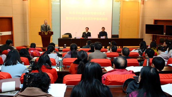 為提高我校教師國家社科基金項(xiàng)目和教育部人文社科項(xiàng)目的申報(bào)質(zhì)量和水平,12月5日,應(yīng)我??萍继幯?,中央黨校科研部陳玉侖教授來到我校,為教師作了題為《如何規(guī)范申報(bào)國家社科基金項(xiàng)目與教育部人文社科項(xiàng)目》的專題報(bào)告并受聘為我校兼職教授。副校長劉寶盈主持了報(bào)告會和聘任儀式,副校長劉勇為陳玉侖教授頒發(fā)聘書。馬克思主義學(xué)院、人文學(xué)院、經(jīng)管學(xué)院、藝術(shù)學(xué)院、體育教學(xué)部、健康學(xué)院、建工學(xué)院相關(guān)專業(yè)教師100余人聽取了報(bào)告。