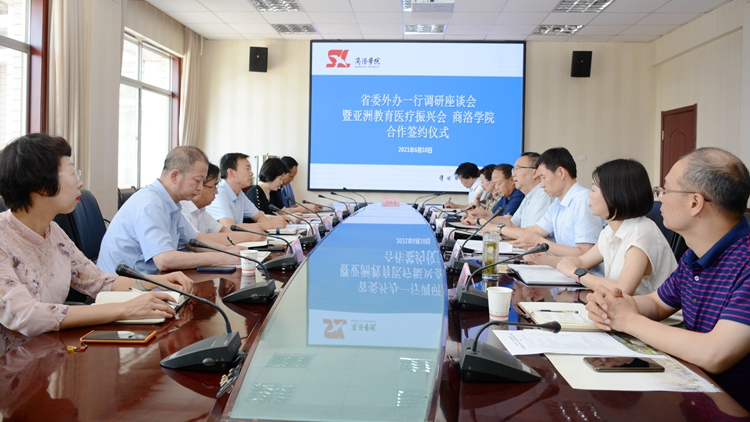 6月10日,中共陜西省委外事工作委員會辦公室二級巡視員姬文魁,陜西省人民對外友好協(xié)會亞非部部長李鳳麗、商洛市歸國華僑聯(lián)合會黨組書記劉彥鋒、亞洲教育醫(yī)療振興會會長李俊峰、商洛市委辦紀(jì)檢監(jiān)察組組長何筠一行來校調(diào)研座談。黨委書記龍治剛出席座談會,黨委副書記劉勇代表學(xué)校與亞洲教育醫(yī)療振興會簽署了友好合作協(xié)議書。