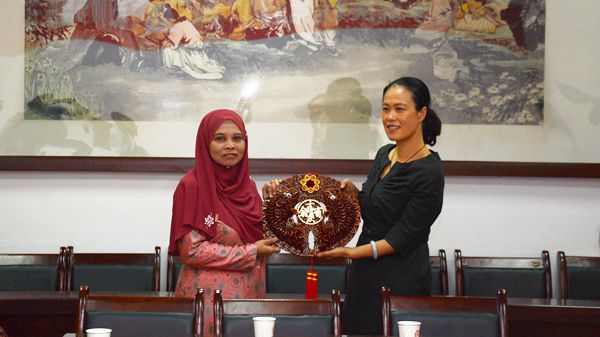 經(jīng)濟(jì)管理學(xué)院副院長(zhǎng)周小婷向Hazlina老師贈(zèng)送了以商洛核桃為材質(zhì)的工藝品——“吉慶有余”中國(guó)結(jié),祝愿兩校之間的合作百尺竿頭,更進(jìn)一步,祝愿兩校師生之間的友誼地久天長(zhǎng)。