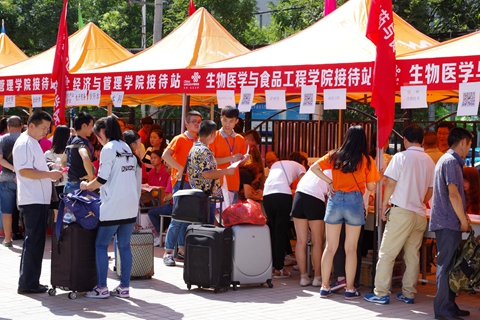 迎新期間,我校精心部署、周密安排,各部門、各二級學(xué)院緊密配合,確保整個迎新工作順利進(jìn)行。為方便外省市新生順利入校,學(xué)校在火車站、汽車站和校門口等地方分別設(shè)立迎新接待點(diǎn),校車一路暢通,日夜不間歇接送,為新生及家長們提供便利服務(wù)。校內(nèi)設(shè)立了新生咨詢處、行李寄存處、公安執(zhí)勤處、醫(yī)療服務(wù)處、家長休息區(qū)、繳費(fèi)處、戶籍辦理處、軍訓(xùn)服裝發(fā)放處、銀行卡與通信卡辦理處等場點(diǎn),為家境貧困的學(xué)生開放了“綠色通道”,辦理助學(xué)貸款。各個路口醒目位置都設(shè)置有迎新指示牌,志愿者們穿梭其中,為新生提供各類咨詢和幫助。