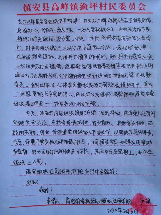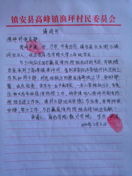 “請村支書給我安排工作任務(wù)”“請黨組織在疫情防控阻擊戰(zhàn)中考驗(yàn)我”。這擲地有聲的話語,是商洛學(xué)院大三女學(xué)生尹淏2月3日和2月6日給高峰鎮(zhèn)漁坪村第一書記王新橋遞交的《請戰(zhàn)書》和《入黨申請書》里的兩句話。