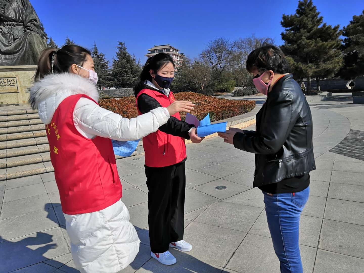 焦思娟與同伴一起發(fā)放疫情防控宣傳冊(cè)