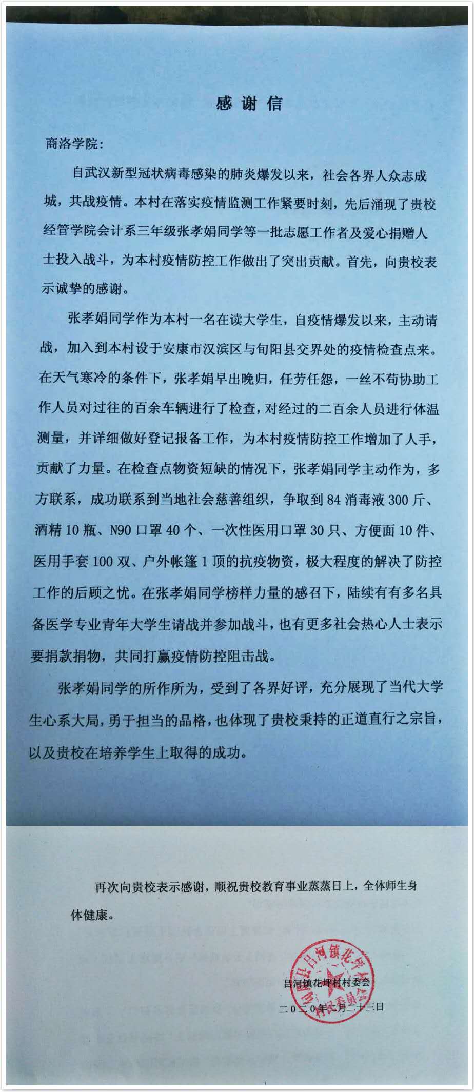 張孝娟同學(xué)的事跡受到鄉(xiāng)鎮(zhèn)領(lǐng)導(dǎo)、公安民警、村委會(huì)書記等人的一致好評(píng),為對(duì)張孝娟同學(xué)本人以及商洛學(xué)院致謝,呂河鎮(zhèn)花坪村村委會(huì)專門向我校發(fā)來了感謝信。
