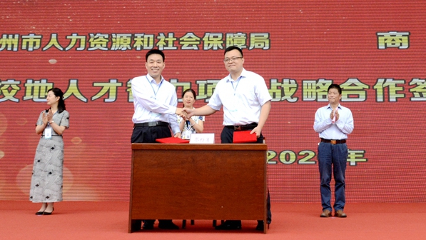 彭虎軍與郭連偉代表雙方簽署校地人才智力項目戰(zhàn)略合作協議,代表我校接受“人才工作站”授牌。