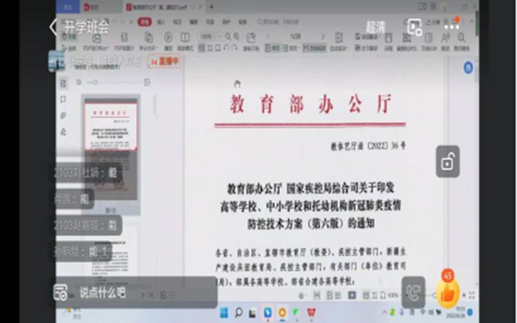 各二級(jí)學(xué)院結(jié)合工作實(shí)際,精心策劃了富有學(xué)院特色的主題班會(huì)。馬克思主義學(xué)院組織師生錄制宣講視頻,針對(duì)疫情防控技術(shù)方案中有關(guān)精神和具體要求進(jìn)行廣泛宣傳。人文學(xué)院以“你我同心協(xié)力,共筑疫情防線”為題,從新修訂的疫情防控技術(shù)方案入手,深入淺出地從“我該怎么做”再次強(qiáng)調(diào)了落實(shí)疫情防控政策的具體細(xì)節(jié)。數(shù)計(jì)學(xué)院重點(diǎn)開展了收心教育,幫助學(xué)生盡快從舒適的暑假生活轉(zhuǎn)到緊張忙碌的線上學(xué)習(xí),號(hào)召全體學(xué)生“收收心 聚聚神”。電信學(xué)院以“勠力同心共戰(zhàn)疫,踔厲奮發(fā)向未來”為主題,分年級(jí)、分專業(yè)圍繞疫情防控、心理健康、職業(yè)發(fā)展、學(xué)業(yè)規(guī)劃、課業(yè)指導(dǎo)、實(shí)習(xí)實(shí)訓(xùn)、學(xué)科競(jìng)賽、文體活動(dòng)等與學(xué)生進(jìn)行了交流討論?;膶W(xué)院師生們分享了疫情發(fā)生以來感受到的“中國(guó)精神”和“中國(guó)故事”,開展了一次生動(dòng)的疫情防控和愛國(guó)主義教育。生物學(xué)院從班風(fēng)學(xué)風(fēng)建設(shè)入手,鼓勵(lì)同學(xué)們結(jié)合自身特點(diǎn),科學(xué)做好學(xué)年規(guī)劃,積極籌備考證、參加科創(chuàng)比賽、備戰(zhàn)考研和就業(yè),以更加積極認(rèn)真的態(tài)度對(duì)待學(xué)業(yè)和生活。建工學(xué)院以“新學(xué)期、新氣象、新目標(biāo)”為主題,傳達(dá)線上教學(xué)工作的各項(xiàng)部署和注意事項(xiàng),號(hào)召畢業(yè)班學(xué)生搶抓“金九銀十”的就業(yè)機(jī)遇,自信果敢、積極就業(yè)。經(jīng)管學(xué)院教師與全體學(xué)生“相聚云端”,分享了線上高效學(xué)習(xí)專業(yè)課的“小技巧”和“小妙招”,叮囑同學(xué)們務(wù)必每日監(jiān)測(cè)自身健康、做好日常防護(hù)。藝術(shù)學(xué)院重點(diǎn)學(xué)習(xí)了違反疫情防控規(guī)定典型案例,以案例為警示,引導(dǎo)全體學(xué)生牢筑戰(zhàn)“疫”防火墻。健康學(xué)院緊密結(jié)合疫情防控的生動(dòng)實(shí)踐,向?qū)W生解讀國(guó)家疫情防控政策和部署,分享抗疫感人故事,開展心理輔導(dǎo),引導(dǎo)學(xué)生樹立共克時(shí)艱的責(zé)任擔(dān)當(dāng)意識(shí)。