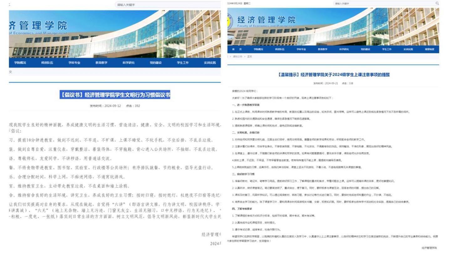 活動(dòng)開展以來,各二級(jí)學(xué)院高度重視、積極響應(yīng),充分對(duì)照學(xué)校大學(xué)生文明行為習(xí)慣養(yǎng)成教育整體安排與具體要求,成立工作專班,組織主題班會(huì),逐班逐人學(xué)習(xí)《高等學(xué)校學(xué)生行為準(zhǔn)則》《商洛學(xué)院大學(xué)生文明行為準(zhǔn)則(試行)》。此外,各二級(jí)學(xué)院還結(jié)合學(xué)院特色與學(xué)生特點(diǎn),組織開展了文明行為養(yǎng)成教育“大討論”,制定了本學(xué)院大學(xué)生文明行為十項(xiàng)準(zhǔn)則、文明行為習(xí)慣養(yǎng)成教育倡議書,推出了文明宿舍創(chuàng)建、文明教室美化、課堂“手機(jī)入袋”等一系列主題教育,在全校營(yíng)造“人人講文明,處處顯文明”的良好氛圍。