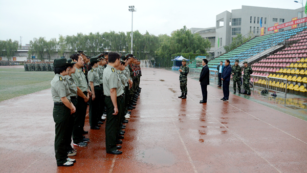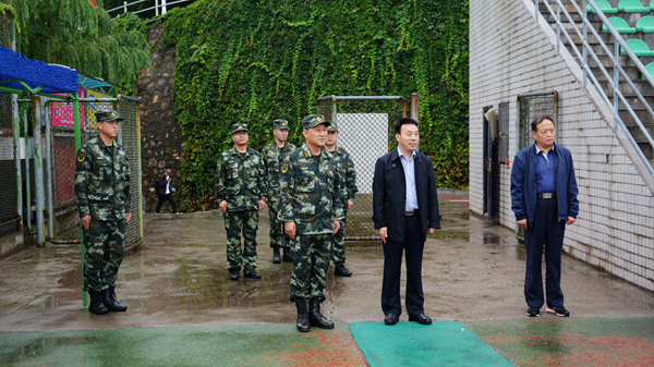 9月18日,武警陜西省總隊(duì)副參謀長連文生大校、武警商洛支隊(duì)支隊(duì)長王平上校、武警商洛支隊(duì)政委梁棟上校一行冒雨來我校視察慰問承訓(xùn)教官與參訓(xùn)師生。黨委副書記彭虎軍陪同檢查。