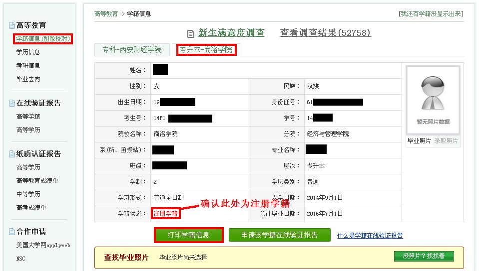 3Q学c信息来自高考及(qing)专升本招考时的原始数据(以录(g)表ؓ(f)准)(j)Q如果信息有误,请及(qing)时联pL务处Q如果属于招考后信息变更Q除2013U专升本毕业班外Q本ơ查询暂不予修改Q?br /> 4Q查询后L(fng)记̎号及(qing)密码Q以备毕业时校对照片Q?br /> 5Q学c信息是毕业证书、学位证书发攑֏(qing)学历、学位电(sh)子注册的重要依据。各学院务必高度重视、广泛宣传,保每位学生查询q核Ҏ(gu)人的学籍信息。如果有学生未及(qing)时查询,造成的一切后果由学生本h承担?br /> 附g1Q学c信息查询结果示意图