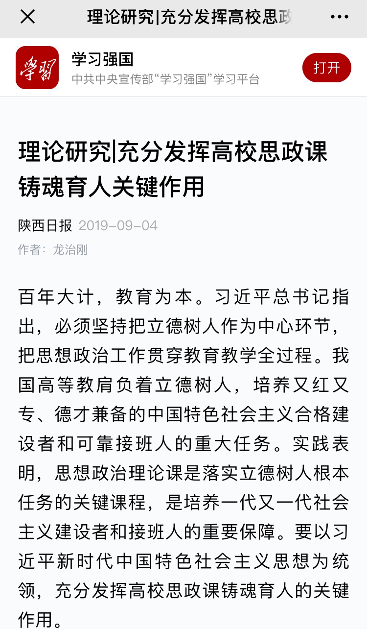 黨委書記龍治剛在《陜西日報》2019年9月4日第6版發(fā)表理論文章《充分發(fā)揮高校思政課鑄魂育人關鍵作用》,學習強國平臺全文轉載。文章內(nèi)容如下: