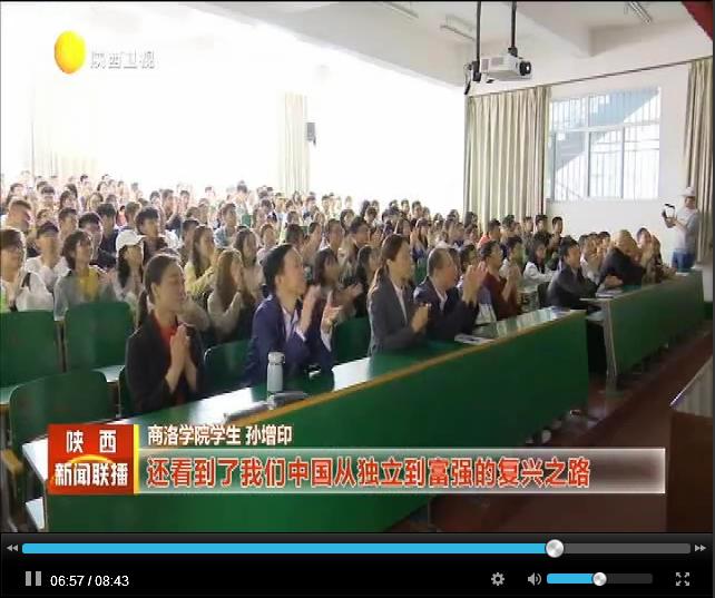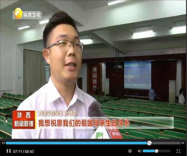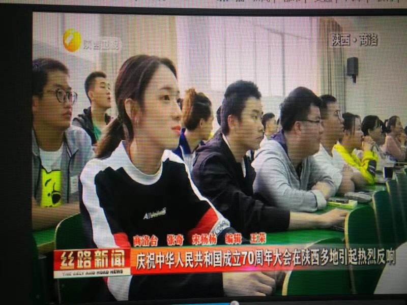 陜西電視臺(tái)《陜西新聞聯(lián)播》《絲路新聞》頻道于10月3日,商洛電視臺(tái)《商洛新聞聯(lián)播》頻道于10月1日,分別對(duì)我校師生集體收看慶祝中華人民共和國(guó)成立70周年大會(huì)、閱兵式、群眾游行直播情況進(jìn)行了報(bào)道。收看現(xiàn)場(chǎng),師生們激情澎湃,教室里不時(shí)響起熱烈掌聲,大家都為祖國(guó)的日益強(qiáng)大感到無(wú)比振奮和自豪。節(jié)目組現(xiàn)場(chǎng)采訪了我校黨委副書(shū)記彭虎軍、學(xué)生許文佳和孫增印。彭虎軍說(shuō):今天是祖國(guó)母親70歲生日,內(nèi)心非常高興,也非常激動(dòng),剛才聆聽(tīng)了習(xí)近平總書(shū)記的重要講話,覺(jué)得很受鼓舞,堅(jiān)定了信心,催人奮進(jìn)。許文佳說(shuō):給我印象最深刻的是飛機(jī)的表演,我們已經(jīng)不是當(dāng)時(shí)剛開(kāi)國(guó)典禮時(shí)僅存的那幾個(gè)飛機(jī),我們現(xiàn)在有高科技的軍事裝備,我們的國(guó)家也越來(lái)越強(qiáng)大,在世界上展示著大國(guó)的風(fēng)采。孫增印說(shuō):在這個(gè)特殊的日子,我想祝愿我們的祖國(guó)母親生日快樂(lè),祝愿我們的國(guó)家更加繁榮昌盛。