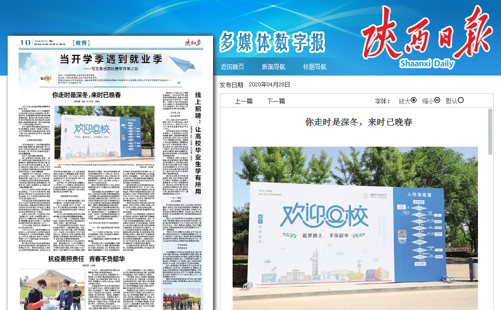按照省教育廳規(guī)定,4月27日各高??梢蚤_始安排畢業(yè)年級(含高職和本、碩、博)、醫(yī)學(xué)專業(yè)、醫(yī)學(xué)類院校和有科研任務(wù)的學(xué)生錯時錯峰返校。近日,陜西日報記者深入省內(nèi)高校,采訪報道了包括我校在內(nèi)的數(shù)所高校,精心做好疫情防控和開學(xué)準備工作,在明媚春光中,敞開校門,擁抱歸來學(xué)子。其中涉及我校內(nèi)容如下: