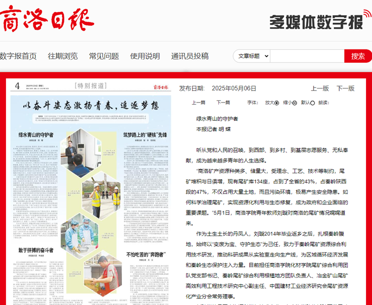 作為土生土長的丹鳳人,劉璇2014年畢業(yè)返鄉(xiāng)之后,扎根秦嶺腹地,始終以“變廢為寶、守護生態(tài)”為己任,致力于秦嶺尾礦資源綜合利用技術研發(fā),推動科研成果從實驗室走向生產線,為區(qū)域循環(huán)經濟發(fā)展和秦嶺生態(tài)保護注入力量。目前擔任商洛學院化材學院尾礦綜合利用團隊黨支部書記、秦嶺尾礦綜合利用根植地方團隊負責人、冶金礦山尾礦高效利用工程技術研究中心副主任、中國建材工業(yè)經濟研究會尾礦資源化產業(yè)分會常務理事。