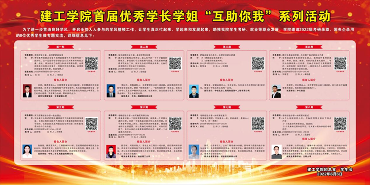 為進(jìn)一步落實學(xué)院學(xué)風(fēng)整頓計劃,營造良好的傳幫帶學(xué)習(xí)氛圍,助推學(xué)生考研、就業(yè)等持續(xù)良性發(fā)展,6月9日至17日,建工學(xué)院依托學(xué)知論壇,舉辦首屆優(yōu)秀學(xué)長學(xué)姐“互助你我”系列講座。本次系列講座共有8場,邀請來自工程管理、土木工程等專業(yè)的8位2022屆優(yōu)秀畢業(yè)生,通過線上線下相結(jié)合的方式分享了自己的考研、就業(yè)與創(chuàng)業(yè)經(jīng)驗。