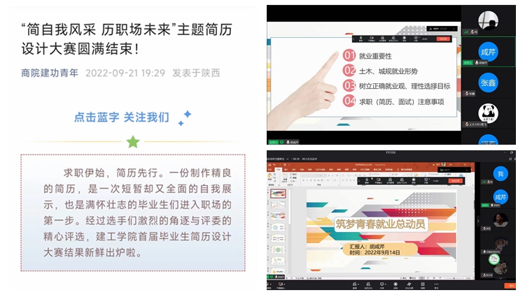機(jī)會(huì)為主,深化“訪企拓崗”成果,擴(kuò)展就業(yè)空間。學(xué)院扎實(shí)落實(shí)“書記校長(zhǎng)訪企拓崗”所達(dá)成校企合作協(xié)議,重點(diǎn)圍繞人才培養(yǎng)與供給,充分發(fā)揮“訪企拓崗”成果效應(yīng)。一是不斷優(yōu)化校企互動(dòng)互補(bǔ)機(jī)制。緊抓企業(yè)人才需求點(diǎn),實(shí)施專人專場(chǎng)專單位制度,重點(diǎn)邀請(qǐng)中天西北建設(shè)投資集團(tuán)有限公司、中國(guó)核工業(yè)二四建設(shè)有限公司、陜西建工第一建設(shè)集團(tuán)等10家訪企拓崗企業(yè)開展線上招聘宣講會(huì);發(fā)揮已聘校企聯(lián)絡(luò)員作用,邀請(qǐng)中國(guó)能源建設(shè)集團(tuán)江蘇電力第一建設(shè)公司等國(guó)企或央企同步開展招聘宣講。截至23日,已有19家單位開展了線上招聘宣講會(huì),共提供招聘崗位970余個(gè),是本屆畢業(yè)生人數(shù)的3倍,為學(xué)生就業(yè)提供了充分的就業(yè)機(jī)會(huì)。二是舉辦簡(jiǎn)歷設(shè)計(jì)大賽。為了增強(qiáng)學(xué)生的就業(yè)意識(shí),幫助學(xué)生確立合理的就業(yè)定位,讓學(xué)生就業(yè)“有備而發(fā)”,學(xué)院通過(guò)舉辦首屆簡(jiǎn)歷設(shè)計(jì)大賽,鼓勵(lì)所有畢業(yè)生設(shè)計(jì)和制作能夠充分展示自己專業(yè)技能的就業(yè)簡(jiǎn)歷,來(lái)自城鄉(xiāng)規(guī)劃等4個(gè)專業(yè)的119名畢業(yè)生設(shè)計(jì)制作的簡(jiǎn)歷入圍本次大賽,其中部分獲獎(jiǎng)學(xué)生已與企業(yè)簽訂了就業(yè)協(xié)議。