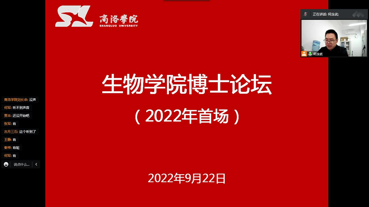 9月22日,生物醫(yī)藥與食品工程學(xué)院博士論壇2022年首場(chǎng)學(xué)術(shù)交流活動(dòng)在云端順利舉行。本次論壇特邀我院2位客座教授——西北大學(xué)博士生導(dǎo)師趙桂仿,陜西省農(nóng)村科技開發(fā)中心、陜西省獼猴桃工程技術(shù)研究中心主任雷玉山研究員蒞臨云端全程指導(dǎo)。生物學(xué)院院長(zhǎng)王學(xué)軍出席論壇活動(dòng)。生物學(xué)院全體教師及部分畢業(yè)班學(xué)生在線上參加論壇。論壇由副院長(zhǎng)何念武主持。