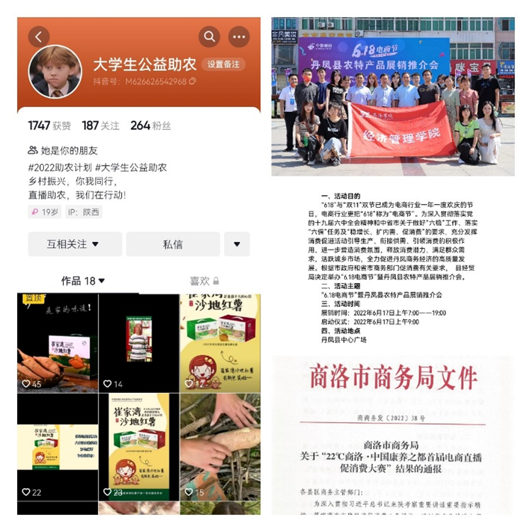 加強(qiáng)技術(shù)幫扶,推動(dòng)縣域經(jīng)濟(jì)發(fā)展。學(xué)院根植地方“電子商務(wù)助力數(shù)字鄉(xiāng)村建設(shè)與縣域產(chǎn)業(yè)結(jié)構(gòu)升級團(tuán)隊(duì)”圍繞自身學(xué)科優(yōu)勢,以丹鳳縣2022年“6·18電商節(jié)”暨農(nóng)特產(chǎn)品展銷推介會(huì)為契機(jī),結(jié)合“經(jīng)管院首屆直播大賽”的舉辦,充分利用在校師生在短視頻運(yùn)營、電商直播的專業(yè)積累,助力如陜西商於本草中藥材有限公司、丹鳳葡萄酒廠等丹鳳縣特色農(nóng)產(chǎn)品經(jīng)營企業(yè)開展直播銷售,形成一批具有一定人氣和粉絲量的電商助農(nóng)類運(yùn)營賬號,借助電商營銷手段、模式充分促進(jìn)活動(dòng)引導(dǎo)生產(chǎn)、銜接供需、引領(lǐng)消費(fèi)的積極作用,活躍城鄉(xiāng)市場,促進(jìn)丹鳳電子商務(wù)經(jīng)濟(jì)的高質(zhì)量發(fā)展。